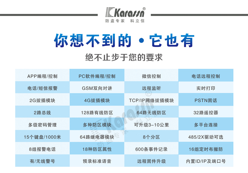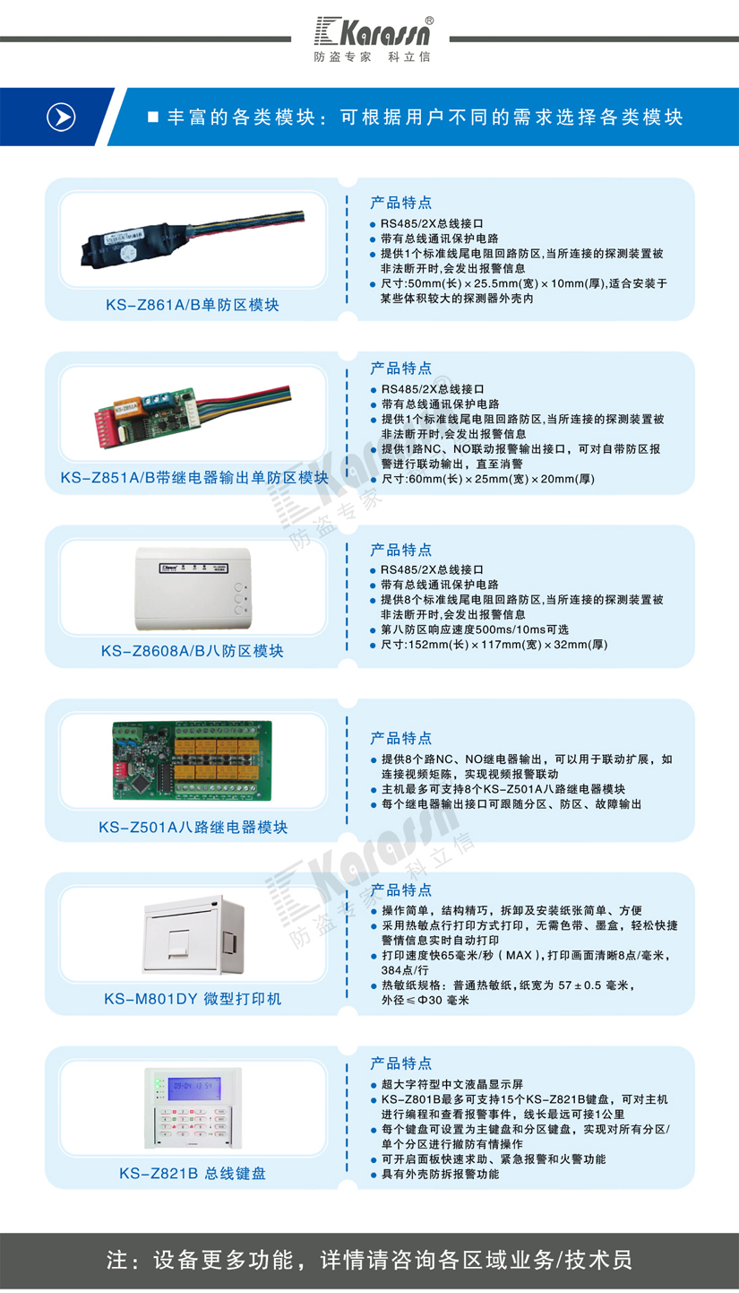 【概要描述】 KS-Z801A(新) 系統是一套由報警控制器、鍵盤、隔離器、繼電器模塊、防區模塊、通訊模塊等其它模...